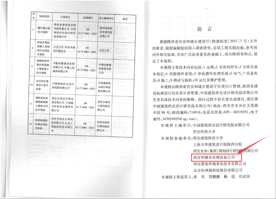 2023年8月30日起,陜西省《景觀水體循環及處理技術規程》DB61/T 5058-2023工程建設標準正式發布實施,本規程是根據陜西省住房和城鄉建設廳文件要求,規程編制經過深入調查研究,總結工程實踐經驗,結合陜西省特點制定,由中國建筑西北設計研究院有限公司,西安科技大學主編;西安建筑科技大學、上海天華建筑設計院陜西分院、西安水務(集團)規劃設計研究院有限公司、西安華浦水處理設備有限公司、西安景苑環境美化技術有限公司,北京科凈源科技股份有限公司參編。