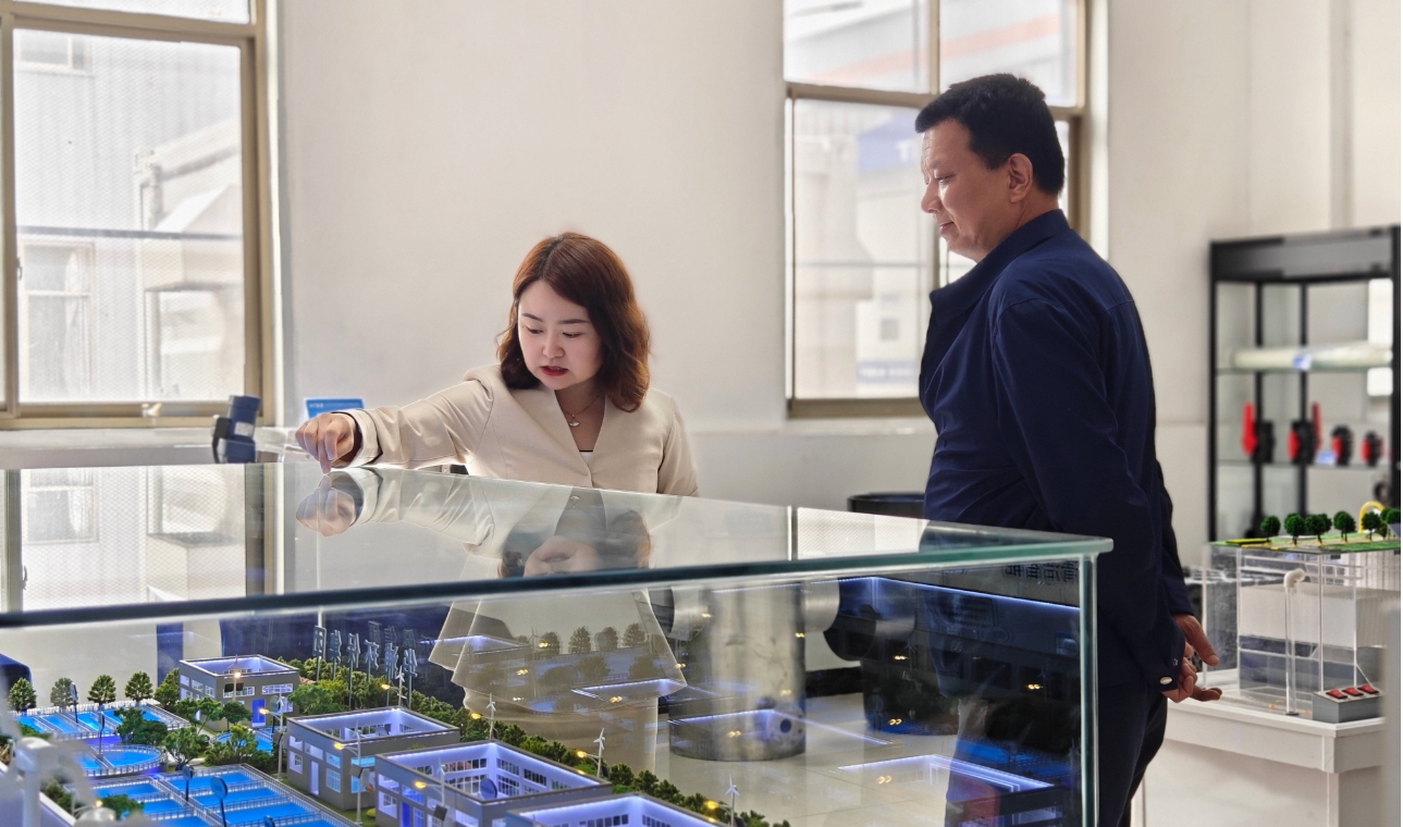 在張玫總裁的陪同下,考察團首先參觀了我司的現代化環保設備生產基地,深入了解了水處理設備生產線的運作流程以及設備展廳中的各類環保產品。在參觀過程中,張玫總裁向考察團詳細介紹了我司的發展歷程、當前發展狀況及未來的戰略規劃。在降低能耗、提高水處理效率以及實現資源最大化利用的污水處理、凈水處理與中水回收系統方面所取得的成果,得到了考察團的高度贊賞。